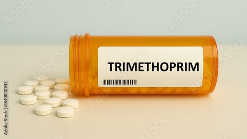 Box of TRIMETHOPRIM tablets placed on a hospital pharmacy table used for urinary tract infections, a antibiotic.