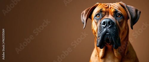Boxer dog with soulful expression gazing intently against brown background with copy space