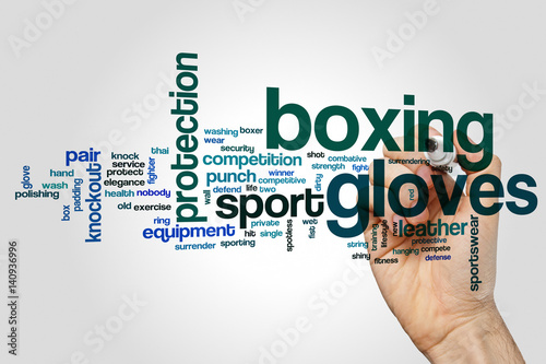 Boxing gloves word cloud concept on grey background