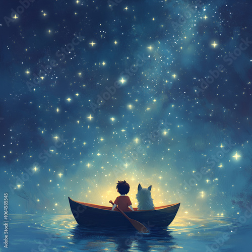 Boy and Dog Under Starry Sky
