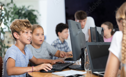 Boy and girl students learn to use computer during lesson in classroom