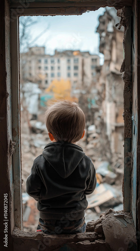 Boy gazes at destroyed cityscape from shattered home in urban aftermath