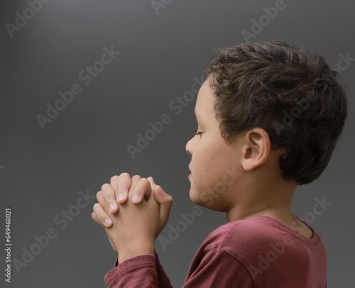 boy praying to God with hands held together with closed eyes with people stock image stock photo