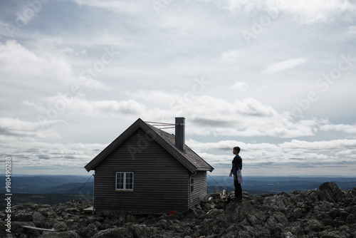 boy stood next to a mountain hut at the summit of a mountain in Norway