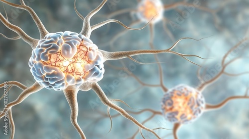 Brain disease, close-up of brain cells affected by disease, highlighting damaged regions