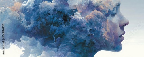 Brain fog long covid symptom concentration problems concept. A surreal depiction of thoughts represented as colorful clouds.