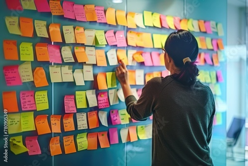 Brainstorming for a strategy plan. Colorful sticky notes with things to do on office board.