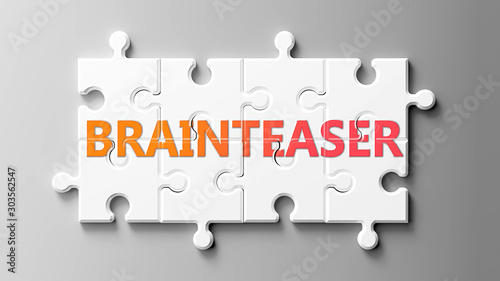 Brainteaser complex like a puzzle - pictured as word Brainteaser on a puzzle pieces to show that Brainteaser can be difficult and needs cooperating pieces that fit together, 3d illustration