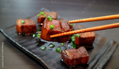 Braised pork belly oriental style food appetizer on dark background. Selective focus.