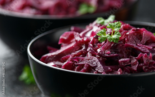 Braised Red Cabbage with apples and redcurrant in black bowl