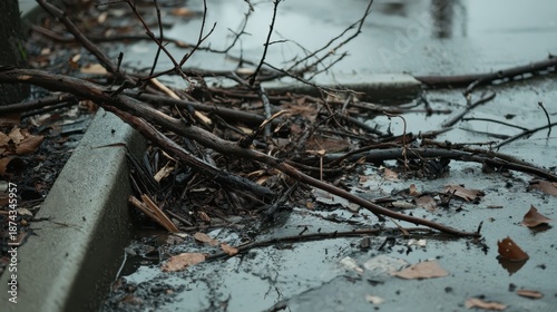 Branches and organic debris forming a blockage in a storm drain on a wet paved surface