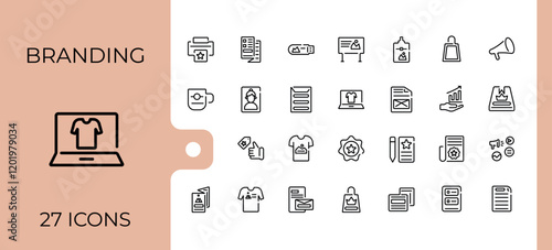 Branding linear icon collection. Includes thin line development, media, web, marketing, quality, loyal, stationery, customer. Collection for mobile and web apps. Editable stroke. Vector illustration.