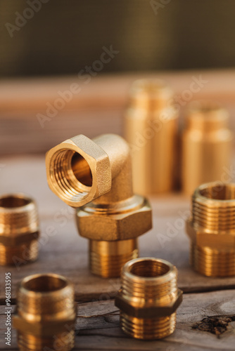 Brass plumbing fittings lying on a rustic wooden table on a sunny day (selective focus)