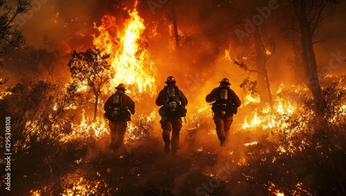 Brave Firefighters Battling a Wildfire in Dense Forest Under Fiery Skies, Showcasing Courage and Resilience in an Intense Climate Disaster Scenario