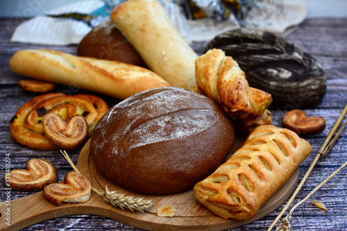 Bread, rolls, baguette, pastries on a rustic wooden background. Close-up