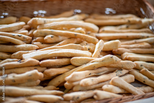 Breadsticks, grissini, grissino, sold in the form of bars. French sticks, salted with caraway, onion, anise from crispy, dry bread, selective focus. Grissini sold in the bakery. Craft baking.
