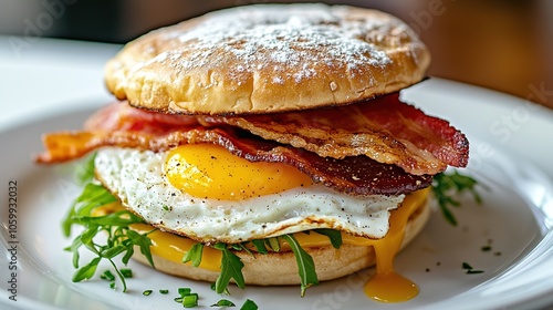 Breakfast Burger with Bacon, Egg, and Cheese on White Plate.