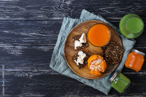 Breakfast, kiwi juice, carrot juice, crackers and cheese are served on a wooden plate. View from above.