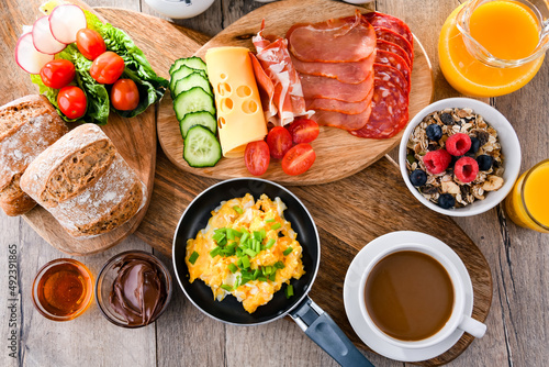 Breakfast served with coffee, scrambled eggs, cereals and ham