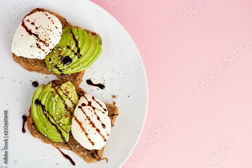 Breakfast toast with poached egg and avocado on the white plate. Pink background