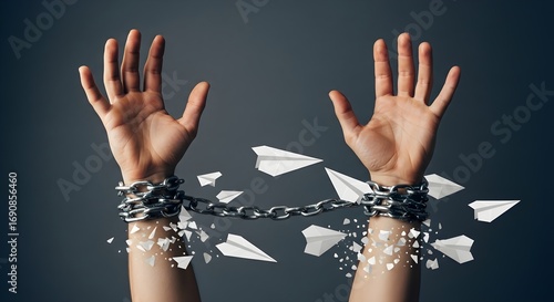 Breaking free from limitations, hands shattering chains with paper airplanes taking flight