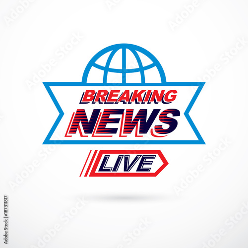 Breaking live news inscription, journalism theme vector emblem created with Earth planet illustration.