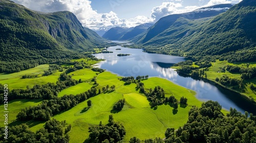 Breathtaking Aerial View of Lush Green Valley and Serene Lake Surrounded by Majestic Mountains and Clouds