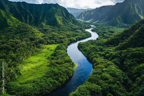Breathtaking Aerial View of Lush Green Valley with Meandering River