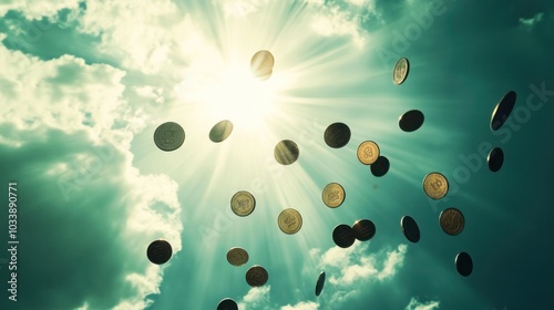 breathtaking silhouette of banknotes floating down from a brilliant sun,