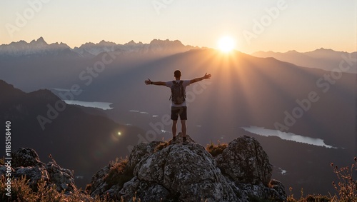 Breathtaking sunrise view from mountain peak with hiker embracing the moment