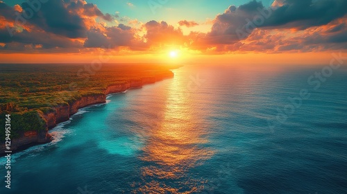 Breathtaking sunset over a tranquil ocean, highlighting cliffs and lush greenery along the coast