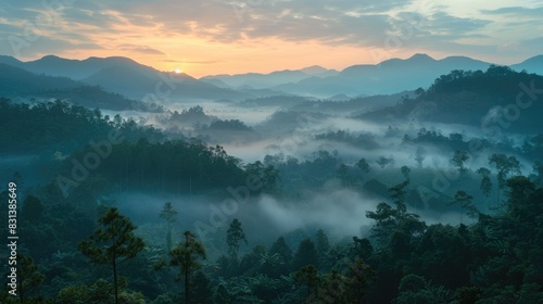 Breathtaking view of a misty forest valley at sunrise, with sunlight breaking through the clouds and casting a golden glow over the lush green landscape.