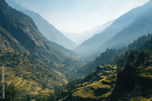 Breathtaking view of mountain trail leading to clearing through valley.