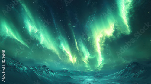 Breathtaking view of vibrant green Northern Lights aurora borealis illuminating the night sky over snow covered mountainous landscape with starry sky in the background