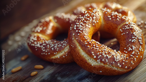 Bretzels dorés avec gros sel servis avec de la moutarde
