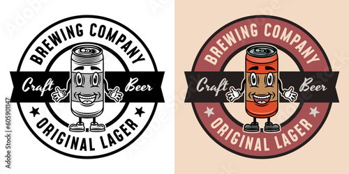 Brewery company vector round emblem, badge, label or logo with beer can smiling character. Two styles monochrome and colored with removable textures