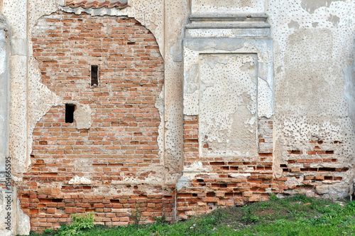 Brick wall of an old building with peeling plaster and traces of bullet holes.