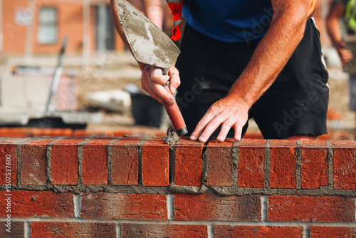 Bricklayer laying bricks on building site