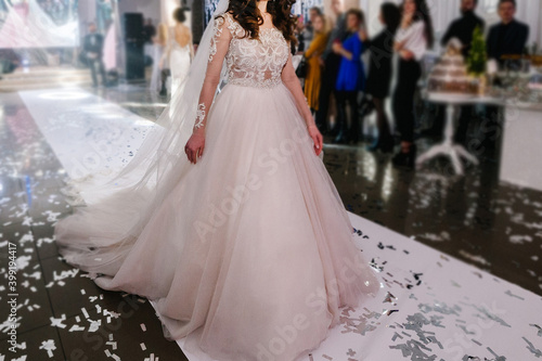 Bride at ceremony in wedding day. Woman in an expensive, luxury dress, details of models walking on the collection catwalk during the Bridal Week runway.