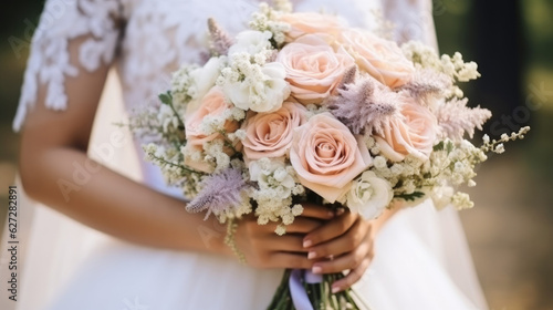 Bride holding a beautiful bouquet of colorful fresh flowers in her hands.