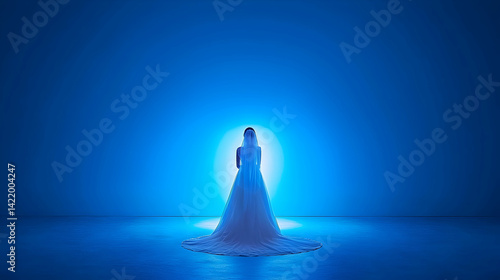 Bride in White Wedding Dress Back View Blue Studio Lighting