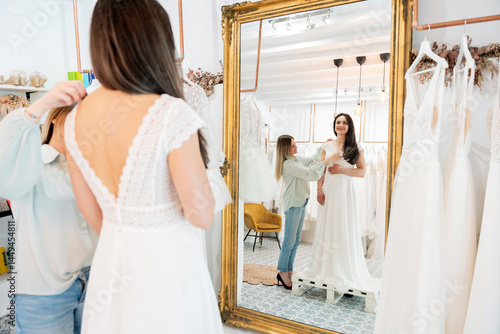 Bride trying on wedding gown with bridal shop assistant in boutique