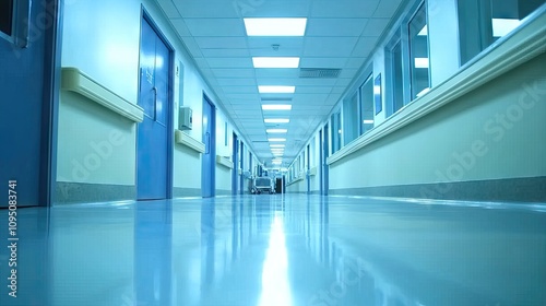 Bright and Clean Hospital Corridor with Reflections on the Floor, Ideal for Medical and Healthcare Themes, Perfect for Stock Photo and Marketing Needs