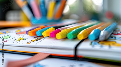 Bright and Colorful Markers Lined Up on an Open Sketchbook Filled with Creative Doodles and Illustrative Designs