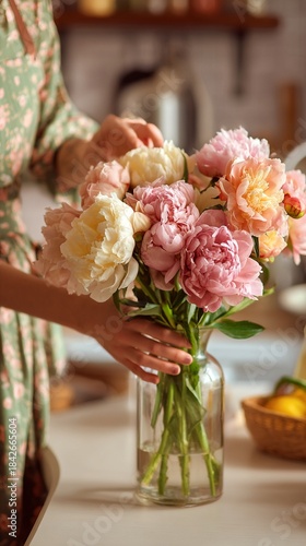 Bright and colorful peonies in a glass vase, beautifully arranged by a person in a floral dress in a cozy kitchen setting, radiating warmth and joy in home decor.