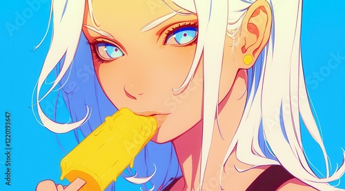 Bright and Colorful Portrait of a Young Woman Enjoying a Yellow Popsicle Against a Vibrant Blue Background