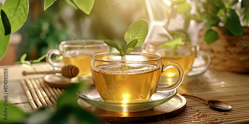 Bright and glowing cups of herbal tea with fresh green leaves, evoking a sense of relaxation and wellness, perfect for a calm and healthy tea-drinking experience.