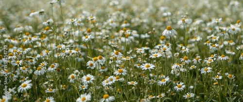 Bright and lively chamomile field with many tiny yellowish white blossoms in summer