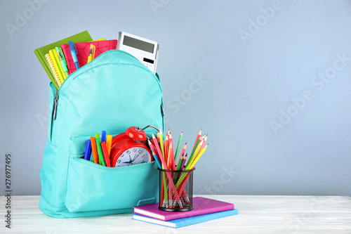 Bright backpack with school stationery on white wooden table against light background, space for text