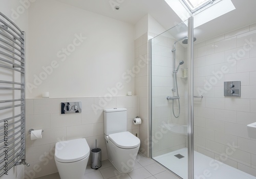 Bright bathroom interior with toilet, bidet, shower and heated towel rail